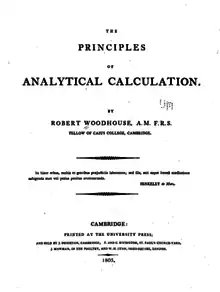 Woodhouse was elected a Fellow of the Royal Society on 16 December 1802.[7] His earliest work, entitled the Principles of Analytical Calculation, was published at Cambridge in 1803.[8] In this he explained the differential notation and strongly pressed the employment of it; but he severely criticised the methods used by continental writers, and their constant assumption of non-evident principles.[9]