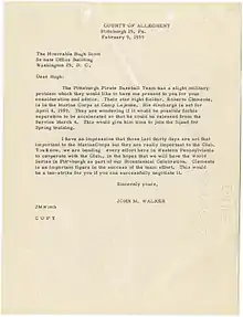 Clemente was still fulfilling his Marine Corps Reserve duty during spring of 1959 and set to be released from Camp Lejeune until April 4. A Pennsylvania state senator, John M. Walker, wrote to US Senator Hugh Scott requesting an early release on March 4 so Clemente could join the team for spring training.[42]