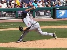 In front of a sellout crowd of 41,721 fans at Cleveland's ballpark Progressive Field, Hernández started the 2011 season for the Indians.[6][7] Hernández posted the worst opening day start in Major League history, as he became the first starting pitcher in 60 years to allow 10 runs in a team's first game.[8] Hernández was the losing pitcher as he threw 88 pitches over 3.0 innings, allowed 11 hits, surrendered 2 home runs, walked 1, allowed 10 earned runs and left the game with an earned run average of 30.00.[9] When pulled from the game, he was booed by fans.[10] The last pitcher to allow 10-plus runs in an opener was Early Wynn of the Washington Senators who accomplished the feat on April 19, 1948. In that game Wynn surrendered 12 runs but managed to pitch 8+1⁄3 innings.[11]