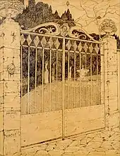 During his lifetime, Montenegro had good relationships with various writers including José Juan Tablada and Luis G. Urbina working with Revista Moderna. In France he collaborated with Le Temoin and in Madrid with Ramón del Valle-Inclán. In Mexico, he associated with a number of writers for a publication called Los Contemporáneos from 1928 to 1931 which included Carlos Pellicer, José Gorostiza and Salvador Novo.[9] The first publication he worked with was Revista Moderna de México, directed by Jesús E. Valenzuela.[6] He began while still living in Guadalajara at age sixteen sending vignettes and drawings for illustrations. He would continue to work with them after he arrived in Mexico City until 1911.[2][3] He had a number of publications in Europe. In 1910, he published twenty drawing in an album called Vingt Dessins with a prologue by Henri de Régnier.[6][10] In 1917, his illustrations were in a children's version of Aladdin published in Barcelona.[6] In 1919, he published a book of drawings called Vaslav Nijinsky: and interpretation of his work in Black-white and gold by Robert Montenegro.[11] In 1933 he published Pintura mexicana (1800–1860) dedicated to the painters of Jalisco. In 1950, he published research on altarpieces called Retablos de México.[12] In 1952 he published an album of twenty drawings with a prologue by Alfonso Reyes.[6]