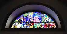 Montenegro's first mural was done while he was living in Mallorca, for the Casino de la Palma.[8][11] He was an early participant in the budding Mexican muralism movement, recruited by Secretary of Education José Vasconcelos and returning to Mexico in 1921.[3][5] His most important mural work is in the former monastery and school of San Pedro y San Pablo, the church portion of which is now the Museo de la Luz.[8] The first mural was done in 1922 called the Arbol de la Vida (Tree of Life) which alludes to the origin and destiny of man. The next was the Fiesta de la Santa Cruz (Festival of the Holy Cross) which depicts a traditional festival related to construction workers on May 3 done between 1923 and 1924.[3] This is considered to be the most important of the murals in this building.[11] Resurrección (Resurrection) was painted between 1931 and 1933. It is a geometric composition with some Cubist influence. In the stairwell of San Pedro y San Pablo, Montenegro painted El Zodíaco (The Zodiac), which was left unfinished in 1923. He came back to it in 1931, finishing it in 1933.[9] In addition to the murals, Montenegro created two stained glass windows influenced by Mexican folk culture called the Jarabe Tapatío (Guadalajara dance) and the La Vendedora de Pericos (The parakeet seller).[3] The work on the building ran into political problems resulting in changed to the original plans. First, Vasconcelos insisted that Montenegro change a depiction of Saint Sebastian, who was partially nude, androgynous and pointing a bow and arrow at the other central figure, a woman, stating it did not represent revolutionary values. In Fiesta de la Cruz, a figure of Vasconcelos was originally included, surrounded by women and holding the flag of the Universidad Nacional de México. When Vasconcelos fell out of favor, this image was painted over and replaced by that of a woman.[11]