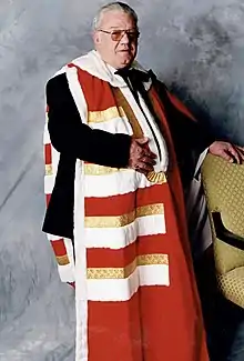 The Parliament robe of a peer is a full-length garment of scarlet wool with a collar of white miniver fur. It is closed at the front with black silk satin ribbon ties (except for a short slit at the neck down half the length of the robe) but open from the shoulder on the right-hand side. (The opposite side is usually tied up with a ribbon to free the left arm.) The back is cut long, as a train, but this is usually kept hooked up inside the garment. Miniver bars (edged with gold oak-leaf lace) on the right-hand side of the robe indicate the rank of the wearer: 4 for a duke, 3½ for a marquess, 3 for an earl, 2½ for a viscount, and 2 for a baron.[2] Today the principal supplier of such robes is the London tailor Ede & Ravenscroft, founded in 1689.[4] These robes are worn by peers at their Introduction to the House of Lords as well as at the State Opening of Parliament. They are also worn by Lords Commissioners when representing the King. They are directed to be worn 'when the peers attend as a body a church service or other ceremony';[5] however in the twentieth century they were only twice worn outside Parliament: at the Investitures of the Prince of Wales in 1911 and 1969. The Parliament robe is only worn by Peers who are sworn members of the House of Lords, and the robe is the same for female peers as for males. (Unlike the Coronation robe, there is no equivalent garment for the wives of peers to wear.)
