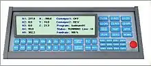 The RoboLogix control panel consists of both robot control functions as well as environment control functions such as conveyor system controls, on-off hard-wired control, etc. The control panel allows the user to command the robot to pick up a tracked object and return it to a home location through jogged commands or pre-programmed positions. With robotic systems in general, angular position movements are commonly used for large (course) motion and linear position movements are often used for smaller (fine) increments.[5] There are several command instructions on the control panel such as Reset, Home, Setup and Zero which are used to automatically set the robot to a specific position for calibration or realignment.