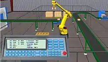 RoboLogix is a robotics simulator which uses a physics engine to emulate robotics applications.[1] The advantages of using robotics simulation tools such as RoboLogix are that they save time in the design of robotics applications and they can also increase the level of safety associated with robotic equipment since various "what if" scenarios can be tried and tested before the system is activated.[2] RoboLogix provides a platform to teach, test, run, and debug programs that have been written using a five-axis industrial robot in a range of applications and functions. These applications include pick-and-place, palletizing, welding, and painting.