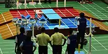 The National ABU Robocon 2014 was held in the Badminton Hall of the Shree Shiv Chhatrapati Sports Complex, Balewadi, Pune on the 6, 7 & 8 March 2014. The theme for Robocon 2014 declared by MITAOE was "A SALUTE TO PARENTHOOD". Institute of Technology, Nirma University, Ahmedabad won the National Contest while Veermata Jijabai Technological Institute (VJTI), Mumbai were the First Runner-up. Both these Institutes got the chance to represent India in the International Contest. MIT Robocon Tech Team representing Maharashtra Institute of Technology, Pune were the Second Runner-up.[19][20][21]