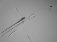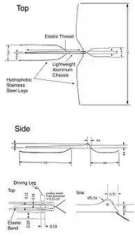 Robostrider does not break the surface layer of the water despite leg speeds of 18 centimetres per second (7.1 in/s) it generates both capillary waves and vortices while in motion, as do Gerridae. Hu and Bush state that Robostrider moves "in a style less elegant than its natural counterpart" [1] but point out that it can cover 20 centimetres (7.9 in) in five strides, with one winding.