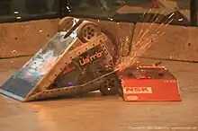 • Wedge – Similar in concept to a rammer, the wedge uses a low-clearance inclined wedge or scoop to move in under an opponent and break its contact with the arena floor – decreasing its mobility and rendering it easy to push off into a wall or hazard. The wedge is also useful in deflecting attacks by other robots. Small wedge-lets are used to lift an opposing bot and feed it to a secondary weapon system. A small wedge may be attached to the rear of a robot with other weaponry for use as a 'backup' in case the main weapon fails. Like rammers, modern wedges must be combined with some other weapon in order to be legal in some modern competitions. The lower the degree of inclination of the wedge, the higher the chances of lifting the opponent bot from the ground. The 1995 US Robot Wars middleweight champion La Machine was an early and effective static wedge design, as was Robot Wars Series 1 champion, Roadblock in 1997. Two-time lightweight BattleBots champion Dr. Inferno Jr. was a low rectangular machine surrounded on all sides by hinged wedges. 2018 BattleBots competitor DUCK! utilized a powered lifting wedge.[12] Original Sin is a four-wheeled ramming robot which has won eight heavyweight RoboGames competitions thanks to a combination of durability and hinged wedges. The Panzer series of robots have managed to win several competitions (Robotica season 3 and both seasons of Robot Wars: Extreme Warriors) with six-wheeled drive and a powered or unpowered wedge.