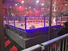 The Robot Wars arena, as pictured for the filming of Robot Wars Series 10 in 2017. Bots pictured are Behemoth (a scoop flipper), Donald Thump (a vertical bar spinner), Sabretooth (a drum spinner), and house robot Shunt (a non-competitor with a lifting scoop and bladed axe).