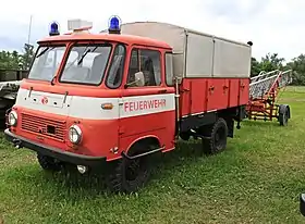 The Robur LO 1801 A is a forward control off-road truck, made by East German manufacturer VEB Robur-Werke Zittau. It was produced from 1965 to 1973, alongside the on-road model LO 2501. Unlike the on-road model, the LO 1801 A has all-wheel drive, which came at the cost of a reduced payload. LO 1801 A is an abbreviation for air-cooled otto, 1800 kg payload, all-wheel drive.