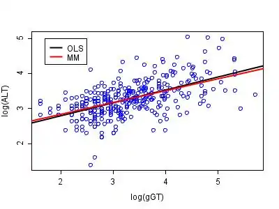 The BUPA liver data have been studied by various authors, including Breiman (2001). The data can be found at the classic data sets page, and there is some discussion in the article on the Box–Cox transformation. A plot of the logs of ALT versus the logs of γGT appears below. The two regression lines are those estimated by ordinary least squares (OLS) and by robust MM-estimation. The analysis was performed in R using software made available by Venables and Ripley (2002).