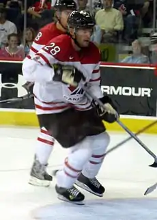 He played in his second world championship in 2005, where he won a silver medal after Canada lost the final to the Czech Republic 3–0.[57] The following year, he was named to the Canadian Olympic team for the 2006 Winter Olympics.[58] He recorded one assist in six games,[10] though Canada was unable to defend its 2002 gold medal, failing to medal entirely.[59] Regehr participated in team Canada's orientation camp for the 2010 Games in the hopes of earning a second opportunity to win an Olympic medal.[45]