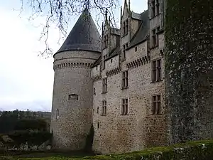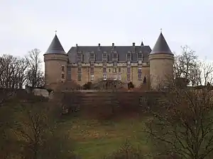 At the end of the 13th century, Aimeric XI renounced a large part of his privileges and promulgated a charter of enfranchisement which transformed Rochechouart into a democratic city, and turned its inhabitants from slaves to the state into citizens. The city was from then on governed by four consuls who chose their own successors, without their lord's intervention. At the same time the viscount suppressed all direct taxes such as the "taille" and the "quête" and abolished duties of service to the feudal lord. He also accorded the inhabitants of Rochechouart the essential conditions for total liberty – they could dispose of their goods, buy or sell, import and export whatever they wanted, build, move about freely within the viscountcy, all without intervention from their lord. This Charter was very advanced for its times, and despite pressure from the other lords in the region, it remained in force until 1789.[5] François de Rochechouart in the late 15th century is known for his study on the Dialogues of Pierre Salmon, the secretary of Charles VI of France.[6] Before the French Revolution, Rochechouart administratively depended on the Province of Poitou, the viscounts of Rochechouart being vassals of the Count of Poitiers, and religiously, it was under the control of the diocese of Limoges.