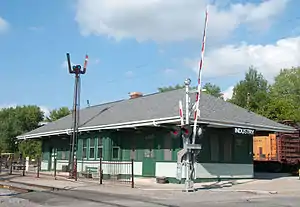 ![]() The former Erie Railroad depot in 2010. The semaphore train order signal and milepost denoting the length to Jersey City, New Jersey are visible. | |||||||||||