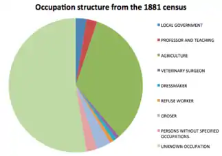Historically, employment in Rochford was firmly based within the agriculture sector, which employed over 33.5% of the population in 1881.[8] According to the 2011 census there was currently nobody employed within the agricultural sector: of the 118 people of working age in Rochford (those aged 16–74 in employment), 23.7% were skilled tradespersons and 15.3% were employed in a senior capacity as either directors or managers.[9] The 1881 census also revealed that over 50% of the population were of unknown occupation or not in employment. The pie chart shows the types of occupations of the population of Rochford, and the percentage of the population employed in each sector.