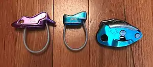 Sometimes called "figure of eight" or just "eight", this device is most commonly used as a descender, but may also be used as a belay device in the absence of more appropriate equipment. It is an aluminum or steel "8" shaped device but comes in several varieties (e.g. the Rescue eight variation (see image opposite) with "ears" or "wings" which prevent the rope from "locking up" or creating a larks head or girth hitch).