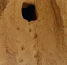 In these cases, many of the rooms are connected by a branched tunnel system. The entrances are usually open, since the main purpose of these, unlike the underground cities, was not really to be hidden. Nevertheless, entry is sometimes made very difficult by the fact that the vertical cliff-faces had to be clambered up using simple hand and footholds. Inside the internal tunnel system, too, moving around is made difficult by steep, narrow passageways and vertical chimneys. In many of these places, dovecotes are carved in the high cliff walls, often with colourfully painted entrance holes. The colour would attract the birds, which then made their nests in them. These dovecotes were accessed once a year by difficult climbing manoeuvres and the birds' excrement was collected for use as fertiliser.[10][11] Pre-existing holes were converted into dovecotes by cutting niches for nests and walling up entrances.