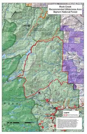 A roadless area is the designation for backcountry, undeveloped lands having wilderness attributes as specified in the Wilderness Act of 1964 and that could be considered for inclusion in the National Wilderness Preservation System. The Rock Creek area was inventoried in the Roadless Area Review and Evaluation process (RARE II) and managed under the land management plans of the US Forest Service. The Roadless Area Conservation Rule was a federal regulation that was adopted by the U.S. Forest Service shortly before President William Clinton left office on Jan. 12, 2001. It allowed reasonable exceptions for management activities like fire suppression and other public health safety measures, and permitted projects, such as grazing and mining, with valid existing rights to proceed.[2] At the same time, the national roadless rule attempted to conserve fish and wildlife habitat while not closing any existing access to these lands.[3] At issue are 58.5 million acres (236,000 km²), located in 42 states, but primarily in the West. Within 24 hours of taking office, President Bush's appointees began their campaign, with the timber industry, to undo this new rule. In May 2005, the Bush administration repealed the Roadless Rule, replacing it with a process that allows governors to petition the Forest Service for protection of the national forest roadless lands within their states, but giving the federal government the power to reject the petitions. The states of California, Oregon, New Mexico, and Washington successfully challenged the Bush roadless rule, resulting in reinstatement of the Clinton rule in 2006, the Roadless Area Conservation Rule was re-established. This rule set national guidelines limiting backcountry timber harvest and road construction and reconstruction with a goal of upholding the roadless characteristics found on millions of acres of inventoried roadless areas. The state of Wyoming and the Colorado Mining Association are currently involved in a lawsuit with the 10th U.S. Circuit Court of Appeals on the basis that the 2001 federal rule banning construction of new roads on National Forest land violates the law.[4]