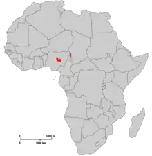 It was first believed that rock firefinches were only endemic to the Jos Plateau in central Nigeria, but observations were also reported in northern Cameroon, which borders eastern Nigeria. Rock firefinches are considered to be range-restricted, since they are mostly found in the Jos Plateau. The Jos Plateau is a rocky habitat with a semi-temperate climate with temperatures ranging from 60 to 80 degrees Fahrenheit. There is a distinct dry season from November to April and rainy season from May to October.[4] Rock firefinches prefer inselbergs in bush savannah habitats and rocky outputs to build their nests in.[5] Inselbergs are isolated hills or mountains that arise from a flat plain. Regardless of the season, rock firefinches live in inselbergs and avoid farmland areas. Rock firefinches have high site fidelity, habitually returning to the same area throughout the whole year.[4] During the dry season, rock firefinches have larger home ranges as a result of traveling to gallery forests to attain water. During the wet season, rock firefinches do not need to travel to distant water resources and therefore have a smaller home range.
