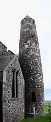 The oldest and tallest of the structure is the well preserved round tower 28 metres (92 ft) high, dating from c.1100. Its entrance is 3.7 metres (12 ft) from the ground, necessitated by a shallow foundation (about 1 metre (3 feet) typical of round towers. The tower was built using the dry stone method. Modern conservationists have filled in some of the tower with mortar for safety reasons.