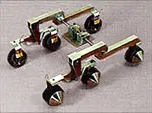 The rocker-bogie system is the suspension arrangement developed in 1988 for use in NASA's Mars rover Sojourner,[1][2][3] and which has since become NASA's favored design for rovers.[4] It has been used in the 2003 Mars Exploration Rover mission robots Spirit and Opportunity,[5] on the 2012 Mars Science Laboratory (MSL) mission's rover Curiosity,[6] and the Mars 2020 rover Perseverance.[7]
