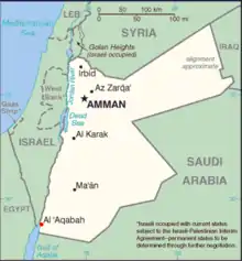 ![]() Al 'Aqabah (Aqaba) shown within Jordan. Eilat lies nearby at the southern tip of Israel, and the Gulf of Aqaba as well as the Egyptian Sinai Peninsula are also shown. | |