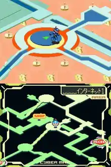 Geo Stelar as Mega Man traversing the internet. The bottom screen displays the map.