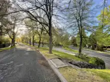 Within the neighborhood is the Rockwood Historic District, which is listed on the National Register of Historic Places. The district is about two blocks wide between Hatch and Arthur streets from 29th Avenue on the south to 14th Avenue on the north, from which it continues turns to the northwest and continues to the northwesternmost corner of the neighborhood.[2] This area of the neighborhood was designed by noted landscape architects, the Olmsted Brothers.[3] It features streets that curve around exposed basalt outcroppings and through old ponderosa pine and Douglas fir forest as they wind their way up the hill from downtown. The Olmsteds were fond of diagonal streets such as Southeast Boulevard that borders the neighborhood. The Rockwood neighborhood borders two of the city's larger parks, but does not contain any true parks within its boundaries. However, in the Rockwood Historic Districts, four small grassy islands are located on Garfield Road and Rockwood Boulevard, known as the Olmsted Triangle Parks, as well as a pair of grassy boulevards that intersect at the intersection of Upper Terrace Road and Rockwood and Highland Boulevards.[4][5] The neighborhood's terrain is reflected in many of the street names, like the aforementioned Rockwood, Highland and Upper Terrace, as well as Crest Road and Overbluff Drive.[6]