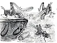 The last major swarms of Rocky Mountain locust were between 1873 and 1877, when the locust caused $200 million in crop damage in Colorado, Kansas, Minnesota, Missouri, Nebraska and other states. One farmer reported that the locusts seemed "like a great white cloud, like a snowstorm, blocking out the sun like vapor".[16] The locusts ate not only the grass and valuable crops, but also leather, wood, sheep's wool, and—in extreme cases—even clothes off peoples' backs. Trains were sometimes brought to a halt after skidding over large numbers of locusts run over on the rails.[17][15] As the swarms worsened, farmers attempted to control them using gunpowder, fires (sometimes dug in trenches to burn as many of the locusts as possible), smearing them with "hopperdozers", a type of plow device pulled behind horses that had a shield that knocked jumping locusts into a pan of liquid poison or fuel, even sucking them into vacuum cleaner–like contraptions, but all of these were ultimately ineffective in stopping the hordes. Charles Valentine Riley, a Missouri entomologist, came up with a recipe for locusts seasoned with salt and pepper and pan-fried in butter. The recipe sold, but some stated that they "would just as soon starve as eat those horrible creatures".[16] Farmers finally responded in force to the swarm's destruction; an 1877 Nebraska law said that anyone between the ages of 16 and 60 had to work at least two days eliminating locusts at hatching time or face a $10 fine. That same year Missouri offered a bounty of $1 a bushel for locusts collected in March, 50 cents a bushel in April, 25 cents in May, and 10 cents in June. Other Great Plains states made similar bounty offers. In the 1880s farmers had recovered sufficiently from their locust woes to be able to send carloads of corn to flood victims in Ohio. They also switched to such resilient crops as winter wheat, which matured in the early summer, before locusts were able to migrate. These new agricultural practices effectively reduced the threat of locusts and greatly contributed to the species' downfall.[16]