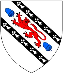 Arms of Rodes: Argent, a lion passant gules between two acorns in bend azure cotised ermines,ref.[1]