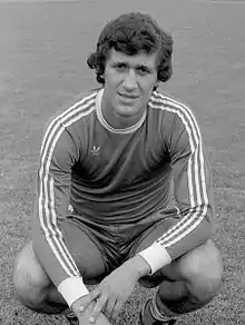 Rodion Cămătaru played 73 matches and scored 21 goals for Romania, making his debut on 13 December 1978 under coach Ștefan Kovács in a friendly which ended with a 2–1 loss against Greece.[16][17] He played two games at the Euro 1980 qualifiers and scored one goal in the 4–1 victory against Yugoslavia in the second leg of the 1977–80 Balkan Cup final.[16] He played six games and scored two goals at the successful Euro 1984 qualifiers, also being used by coach Mircea Lucescu in all three group matches from the final tournament as Romania did not advance to the next stage.[16][18] In the following years, Cămătaru played six games and scored three goals at the 1986 World Cup qualifiers, four games at the Euro 1988 qualifiers, five games and two goals scored at the successful 1990 World Cup qualifiers, being also part of the squad that participated at the final tournament where coach Emeric Jenei did not use him in any games.[4][16] Cămătaru's last appearance for the national team was in a 2–1 loss against Scotland in which he scored Romania's goal at the Euro 1992 qualifiers.[16]