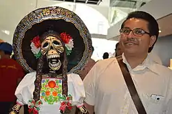 Villena Hernández makes most of the traditional cartonería objects such as piñatas, Lupita dolls, Judas figures, but he has become known for monumental works commissioned by government and cultural institutions in Puebla and Mexico City related to Holy Week, Christmas, Corpus Christi and Day of the Dead.[2][7] Of these, his altars related to Day of the Dead are of particular note, especially the skeletal figures that adorn them.[2] He has created altars in honor of Juan de Palafox y Mendoza (2009) for the Puebla city hall,[8] the Mexican Revolution for the Complejo Cultural Universitaria of the Benemérita Universidad Autónoma de Puebla (2010),[9] the China Poblana with various students for the Puebla city hall (2012)[10] and one for José Guadalupe Posada for the National Museum of Mexican Art in Chicago (2013) .[11] The artisan represents death as something happy, fun and irreverent, with the skeletal figures in movement. His works also show influence from José Guadalupe Posada in their sense of irony.[4]