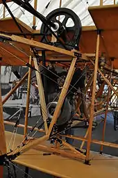 Roe had originally intended to use a four-cylinder inline engine which J.A. Prestwich were developing but this failed when bench-tested by Prestwich, so Roe initially installed the 6 horsepower (hp) JAP engine from his previous aircraft.[2] Taxying trials with this engine were begun in April 1909. At the end of May a new 9 hp (7 kW) JAP engine was delivered, and after fitting this a series of brief flights of around 50 ft (15 m) were made, beginning on 5 June.[3] During these flights Roe experimented with different reduction ratios between the engine and propeller and also with varying pitch settings for the propeller blades, which could be adjusted between flights. On 13 July, he achieved a flight of 100 ft (30 m), and ten days later one of 900 ft (270 m).[1] Over the next two months further successful flights were made and the aircraft was modified slightly: the drive belt was replaced by a chain, the vertical tail surfaces were removed and both the engine and pilot's seat were moved forwards.