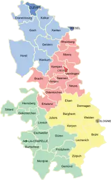 - Krefeld (Crefeld), cantons: Krefeld, Bracht, Erkelenz, Kempen, Moers, Neersen, Neuss, Odenkirchen, Rheinberg, Uerdingen, Viersen