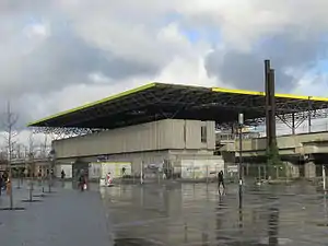 The station lies on a raising verge. There is a big yellow metal roof above the platforms. Because of the open roof construction, there are almost no walls around the platforms but some shelters protect the travellers against the wind. There are 3 tracks and 2 platforms. On the upper storey, there are a few offices. Formerly, signal-station 'Bloc 10' regulated the railway-traffic in the station. The platforms can be reached by stairs, escalators or by lift. Downstairs there are a ticket office and several shops.
