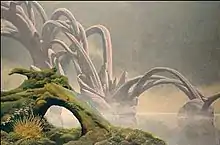 In the 1980s, Dean's output focused on other areas, including stage design, architecture, and video game art. In 1981, he collaborated with his brother Martyn on the Tectonic House, an environmentally-friendly and economic home built to last that was displayed at the annual International Ideal Home Exhibition in Birmingham. The idea spawned from two ideas: Dean's earlier designs for a bed and bedroom intended for the safety of children, and Martyn's "retreat pod" from 1970 that was featured in the Stanley Kubrick film A Clockwork Orange (1971).[11] The project has developed into its current name, Home for Life, and the non-working prototype contains no straight edges or right angles. In the early 2000s, the cost to produce one was estimated to be $72,000–$80,000. Although several local British governments have expressed interest in the project, none have come into fruition.[12][13][7] In 2003, a project involving the construction of 264 villas, chalets, and apartments designed by Dean on a 65-acre site near Stourport-on-Severn, Worcestershire had entered the planning stage.[12]