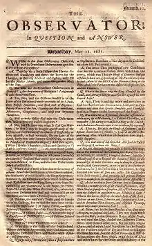 In 1681 L'Estrange founded The Observator, a single sheet printed in double columns on both sides. It was written in the form of a dialogue between a Whig and a Tory (later Trimmer and Observator), with the bias on the side of the latter. During the six years of its existence, L'Estrange wrote with a consistent fierceness, meeting his enemies with personal attacks characterised by sharp wit. One of his main targets was Titus Oates, whose false allegations eventually brought about his conviction for perjury in 1685.[1] The Observator was no longer a mouthpiece for the Court, but represented a provincial Toryism appealing to staunch former Cavaliers like L'Estrange who felt embittered by the Court's pandering to Oates, equivocation towards Whigs, and failure to reward their loyalty. After years dedicated to suppressing the press, L'Estrange began writing a periodical aimed at a mass audience. He maintained an educational and paternalistic stance, arguing the paper was necessary to 'set the masses right' after seditious printings had turned them against their natural superiors.[27]