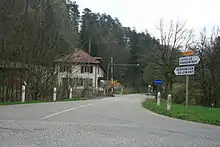 Roggenburg, the westernmost municipality of the canton, is a farming village 8 km (5.0 mi) north of Delémont, the principal town of the canton of Jura. To the north, the village confines extend to the bank of the river Lützel (French: Lucelle), in the hilly landscape of the northern Jura Mountains.