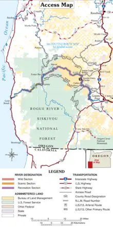 The Rogue River–Siskiyou National Forest is a United States National Forest in the U.S. states of Oregon and California. The formerly separate Rogue River and Siskiyou National Forests were administratively combined in 2004. Now, the Rogue River–Siskiyou National Forest ranges from the crest of the Cascade Range west into the Siskiyou Mountains, covering almost 1.8 million acres (7,300 km2).[4] Forest headquarters are located in Medford, Oregon.