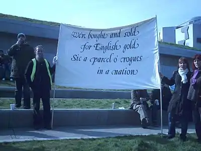 "Such a Parcel of Rogues in a Nation" was written by Scotland's National poet Robert Burns in 1791.[3] He decried those members of the Parliament of Scotland who signed the Act of Union with England in 1707. Burns contrasted their treachery to the country with the tradition of martial valour and resistance commonly associated with such historic figures as Robert the Bruce and William Wallace. The poet states that he wished to have lain in the grave with Bruce or Wallace, rather than having seen this treacherous sale of Scotland were it in his own lifetime.