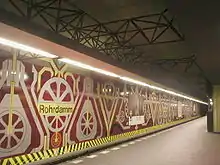 Designed by architect Rümmler, the station was opened on 1 October 1980, as part of the line's extension from Richard-Wagner-Platz to Rohrdamm. Until the second extension of the line from Rohrdamm to Rathaus Spandau in 1984, it was the western terminus of the U7. The name literally means "pipe dam"; as the eponymous street was laid out along a water pipe which gets its water from the Tegeler See and fills the water works in Jungfernheide, from which about 250,000 people get drinking water. The station's machine-like decoration, featuring cog-wheels and pipes, points to this. The adjacent stations are Paulsternstraße and Siemensdamm.[1]