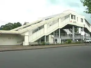 The station has two opposing side platforms serving Track 1 and Track 2 which are on headshunts, allowing for tracks for express trains to pass in between. The platforms are connected by an elevated station building built over the tracks. The station building has automated ticket machines, TOICA automated turnstiles and a staffed ticket office.