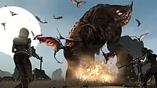 The game's development started around 2005, internally pitched as "Halo meets Diablo".[18] The initial period involved Pitchford selling his team on the idea of the FPS-RPG hybrid, and eventually determining that the FPS genre would be the defining genre for the game.[18] The game's art style was initially more realistic, with visual ideas inspired partially by the Gears of War and Mass Effect series.[18] The team expanded and prepared for releasing the game's first public reveal in September 2007 via a Game Informer cover story, with trailers to be shown in the following year's E3 and other game conventions, building atop a modified Unreal Engine 3.[18][9] Elements that were planned at the time of that cover story but that did not make the final game included procedurally generated "loot caves", and the ability to hire non-playable character mercenaries to help in combat. Further, the game initially had three Vault hunters; Brick had not been included yet, as Gearbox thought that it would be interesting in the co-op to have two or more players playing the same characters but with persistent improvements that the players had made to them.[19]