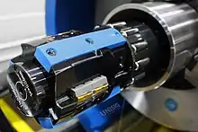 Roller burnishing is a surface finishing technique where hardened rollers cold work surface imperfections to reduce surface roughness. Roller burnishing differs from abrasive surface finishing techniques in that material is displaced rather than removed. The tooling typically consists of a hardened sphere or cylindrical roller.[1] The tooling is pressed into the surface of the part while it is rotated (in some applications, the tools are rotated instead of the part). The burnishing tool rolls against the surface of the part at a constant speed, producing a very consistent finish across the part. A surface finish of less than Ra 0.1 µm is achievable with roller burnishing.[1] A side effect is that the outer surface of the part is work hardened.
