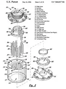 In 2006, Charles C. Cornelius and Shawn P. Lawlor received a patent for a cage-less recirculating roller screw system.[5] As with the traditional recirculating roller screw system, rollers disengage from the screw when they come upon an axial groove in the wall of the nut. The system differs in that the rollers are continually engaged by the nut, and the axial groove of the nut is threaded. Non-helical threads in the axial groove of the nut return the roller to its axial starting position (after completion of an orbit). Non-circular compression rings, or cam rings, at opposite ends of the rollers (roller axles) apply constant pressure between rollers and nut, synchronizing roller rotation and thrusting the rollers into the nut's axial groove. Lacking ring gears and roller cage, cage-less recirculating roller screws can be relatively efficient and, as a result, permit higher dynamic capacities for some screw shaft diameters.[6]