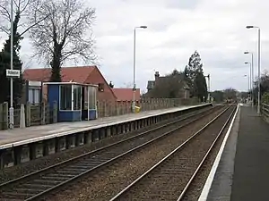 ![]() Looking west towards the shelter, old station house, and level crossing | |