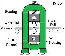 To minimize the roll diameter a four-high or cluster mill is used. A small roll diameter is advantageous because less roll is in contact with the material, which results in a lower force and power requirement. The problem with a small roll is a reduction of stiffness, which is overcome using backup rolls. These backup rolls are larger and contact the back side of the smaller rolls. A four-high mill has four rolls, two small and two large. A cluster mill has more than four rolls, usually in three tiers. These types of mills are commonly used to hot roll wide plates, most cold rolling applications, and to roll foils.[10]