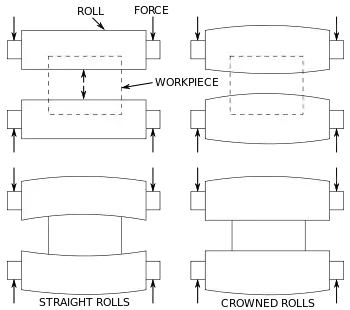 Maintaining a uniform gap between the rolls is difficult because the rolls deflect under the load required to deform the workpiece. The deflection causes the workpiece to be thinner on the edges and thicker in the middle. This can be overcome by using a crowned roller (parabolic crown), however the crowned roller will only compensate for one set of conditions, specifically the material, temperature, and amount of deformation.[12]
