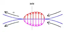 This main principle is illustrated in the figure of the rolling cylinders. If two equal cylinders are pressed together then the contact surface is flat. In the absence of surface friction, contact stresses are normal (i.e. perpendicular) to the contact surface. Consider a particle that enters the contact area at the right side, travels through the contact patch and leaves at the left side. Initially its vertical deformation is increasing, which is resisted by the hysteresis effect. Therefore, an additional pressure is generated to avoid interpenetration of the two surfaces. Later its vertical deformation is decreasing. This is again resisted by the hysteresis effect. In this case this decreases the pressure that is needed to keep the two bodies separate.