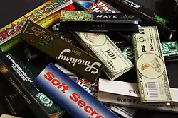 Rolling paper is a specialty paper used for making cigarettes (commercially manufactured filter cigarettes and individually made roll-your-own cigarettes). Rolling papers are packs of several cigarette-size sheets, often folded inside a cardboard wrapper. They are also known as 'blanks', which are used to encase tobacco or cannabis.[1] It may be flavoured.