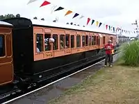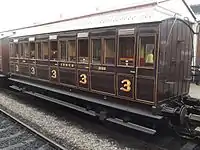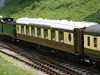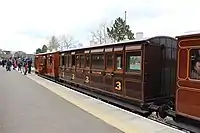 | LCDR | 51 | 4-wheeled Brake Second | Built in 1889, basically identical to 114. In 2009 the carriage gained public support in an appeal on national television for funds toward overhaul, including provision for disabled passengers, something at the time unavailable on the line's vintage trains. It has now entered service in use with the other 4 wheeled coaches, painted in SECR livery as 3360. | ![]() |
